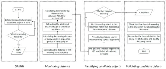 When the query object arrives at the road network node, it records the timestamp and divides the time interval into sub-intervals such that in each sub-interval, the query object moves on the same edge. First, we must execute the direction-aware KNN query algorithm at the starting timestamp to identify the K-nearest neighbor objects that are moving towards the query object. Then, the monitoring range of continuous queries is calculated; the moving objects in the monitoring range may affect the query results. After that, a local road network is established according to the monitoring range and then moving candidates are identified. Finally, the timestamp when the candidate objects replace the query results is determined. If the timestamp is within the specified period, the sub-interval is divided, and the result set is modified. Figure 4 shows the basic process of the algorithm.