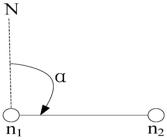 As shown in Figure 5, the horizontal angle between the reference point, which is denoted as n1, and the target directional line, which is denoted as n1n2, is α. In the road network, node is either the starting node or the ending node of edge; hence, the azimuth angle, namely, β, of the road network expansion is or . In Figure 6, if the current accessing node is n3, its extended adjacent edges are e3 and e4, the extended direction has two, when the extended edge , and the extended direction is n3 to n6, then β = β3; when the extended edge and the extended direction is n3 to n4, β = β2.