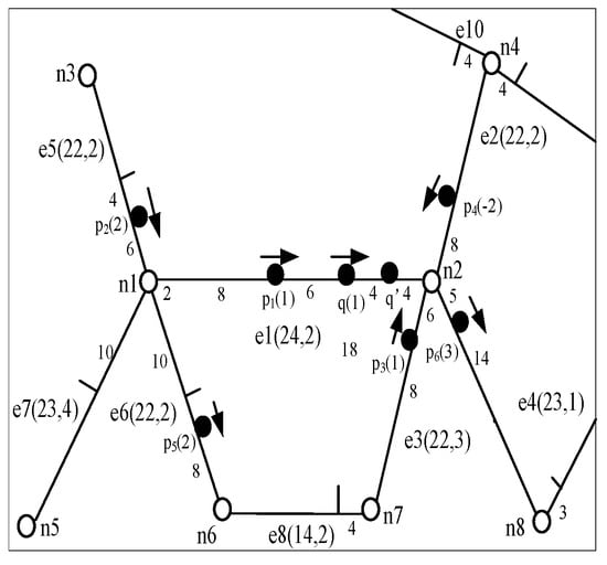 where represents the distance between the object and the starting point of the edge and represents the distance between the object and the ending point of the edge. For example, in Figure 2, the paths are composed of edges and . The moving object, namely, p3, and the query object, namely, q, are located at and , respectively. The object p3 moves towards the starting point, namely, n2; hence, is . The query object q moves towards the ending point, namely, n2; hence, is . The distance between them is . We can find that when the moving object arrives at the node, its moving edge will change, and the four nodes involved in the distance calculation formula also change; thus, once the moving object reaches the node, its distance formula to the query point needs to be recalculated.