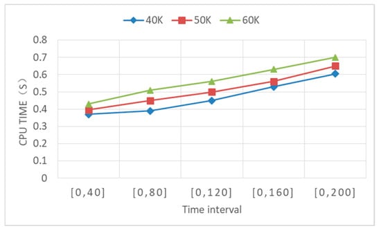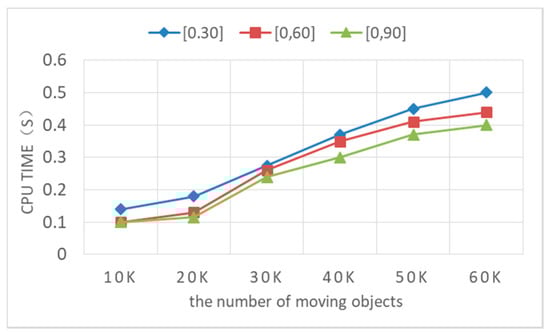 - The influence of the time interval on the overall performance.For 40,000, 50,000, and 60,000 moving objects and 30 nearest neighbors, comparative tests were carried out in various time intervals. The results are shown in Figure 13. As the length of the query time interval increases, the running time increases gradually. The larger the time interval is, the larger the monitoring range is and the larger the number of moving objects that were in the monitoring range. Moreover, with a longer time interval, more candidates arrive at the nodes of the road network in the continuous monitoring range. It is necessary to re-select the moving section, update the calculation formula for the distance from the query object, and divide the sub-intervals. These factors will lead to a higher query time cost as the time interval increases. When the moving objects are distributed in the road network with 265,536 edges, the graph shows that when the number of moving objects is small, the overall query time consumption is stable and the overall query time consumption gradually increases with the time interval. The more moving objects there are in the same time interval, the more moving objects must be retrieved and validated and the longer it takes.