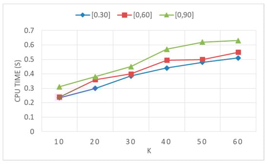 - The influence of the number of moving objects on the query performance.According to Figure 9, the value of K is 30. In the comparative tests, we compared the effects of the number of moving objects on the overall continuous query performance in three-time intervals: [0, 30], [0, 60], and [0, 90]. As shown in this Figure 9, the overall query time increased with the number of moving objects and when the number of moving objects is between 10,000 and 20,000, the query performance among the query intervals tended to be stable. This is because the number of objects in the local road network that was established by the monitoring range increased and the time cost of judging whether each moving object was moving towards the query point and executing the verification algorithm also increased. As shown in Figure 10, according to the number of moving objects in the global road network, the number of moving objects in the local road network that was established by the monitoring range of time intervals [0, 30], [0, 60], and [0, 90] is displayed. The figure shows that as the number of moving objects in the global road network increases gradually, the number of objects in the local road network also increases. The more objects there are, the longer it takes to evaluate the candidate objects. Hence, the complete algorithm becomes more time-consuming as the number of moving objects increases. From Figure 9, we also can see the larger the time interval, the higher the time cost of the algorithm. In different time intervals, when the interval difference is not very large, the calculated monitoring distances are similar and the numbers of moving objects in the local road networks that were established according to the monitoring ranges are almost the same. However, the longer the time interval is, the more time-consuming the whole algorithm will be, because the longer the time interval is, the number of moving objects that have arrived at the nodes increases, the time interval is divided into several sub-intervals according to their arrival times, and the road network distances between them and the query object are recalculated; thus, the time-consuming will increase accordingly.