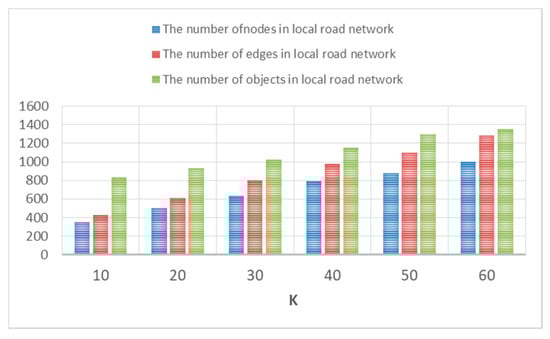 Figure 12. The number of nodes, edges, and moving objects in local road network with different K values. - (3)
