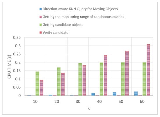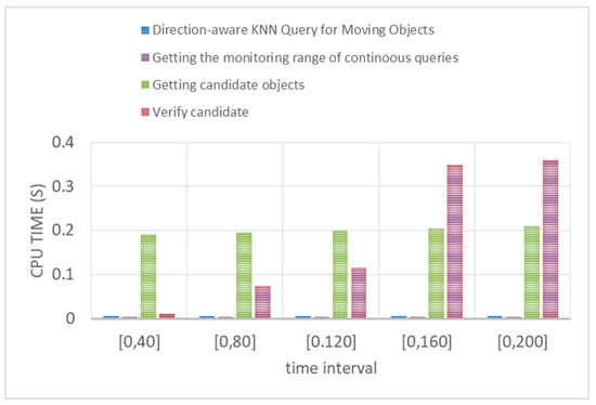 Then, the comparative test makes the following comparisons according to the various query time intervals. When the number of moving objects is 30,000 and the number of neighbors, namely, K, is 10, the time distribution of each stage of the algorithm is observed for various query time intervals: [0, 20], [0, 40], [0, 60], [0, 80], and [0, 100]. In Figure 15, the histogram shows the time distribution of each stage of the algorithm and the time-consumption trend is stable for acquiring direction-aware neighbors and monitoring ranges. When the number of K-nearest neighbors is constant, the time-consumptions of the K-nearest neighbor queries that are acquired at the starting time are stable when the starting times are the same. In the whole process, it is time-consuming to obtain and verify candidate objects. In the stage of obtaining candidate objects, the influential edges are identified according to the monitoring range, a local road network is created, and the moving objects in the local road network are retrieved as candidate objects. With the increase of the time interval, the monitoring range becomes larger and the amount of data that must be processed increases. The time-consumption of the candidate validation stage increases with the time interval. The longer the time interval is, the larger the monitoring range is, the more edges that must be retrieved, and the larger the number of candidates that must be evaluated. Moreover, the longer the time interval is, the larger the number sub-intervals into which it must be divided. For each sub-interval, the candidates must be evaluated; thus, the time-consumption increases with the number of sub-intervals.