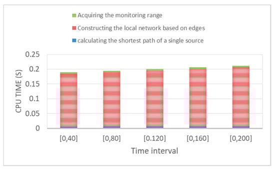 To deal with the continuous K-nearest-neighbor query and improve the query efficiency, we must transform the global network into a small-scale local network to facilitate the retrieval of objects. We analyze the time-consumption of the whole process of constructing the local network. As shown in Figure 16, in the process of local road network construction, the time consumption of determining the monitoring range is very small. According to the size of the monitoring range, the query point-centered edge is acquired and the local road network is constructed on the edge of the monitoring range; this process is time-consuming. As the time interval increases, the monitoring range increases and the acquisition influence edge becomes larger, thereby increasing the processing time. The time consumption for calculating the shortest path of a single source on a local road network is negligible.