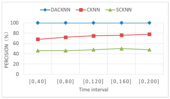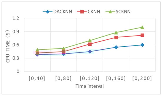 First, we evaluate the effects of the CKNN, SCKNN, and DACKNN algorithms on the time consumption as the time interval increases and their accuracies. Here, accuracy refers to the accuracy with which moving objects that are moving towards the query point are identified, which is expressed as a percentage. According to Figure 17, the time costs of these three algorithms increase with the time interval because more moving objects will arrive at the network nodes over a larger time interval; thus, the time interval is divided into more sub-time intervals for verification. However, the time costs of CKNN and SKNN increase faster as the time interval increases because these two algorithms do not screen out objects that are moving towards the query object, but consider all objects in the monitoring range as candidates; thus, the more objects they deal with, the more time they consume. The DACKNN algorithm can filter out objects that are moving away from the query point in the monitoring range. Thus, the number of candidate objects is smaller; therefore, DACKNN outperforms SCKNN and CKNN in terms of time consumption. Figure 18 shows the accuracies of these three algorithms. The moving objects that are moving towards the query object can be obtained with 100% accuracy by the DACKNN algorithm as the time interval increases, while the accuracy of SCKNN reaches more than 70%, and the accuracy of CKNN is approximately 50%.
