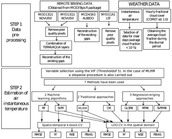 Air temperature (Ta) is a very relevant climatic variable that controls several environmental processes, particularly evapotranspiration [1]; it is also a key feature in global change studies, and reflects the surface energy balance [2]. So, accurate estimations of Ta and its spatio-temporal variability are important in several Earth and environmental sciences and in land surface process modelling [1,3]. Air temperature is usually measured at weather stations at a standard height of 1.5–2 m with diverse temporal resolutions. However, because weather stations provide limited information about spatial patterns at regional or global scales [3], several methods have been used to estimate the spatial distribution of Ta [4,5]: