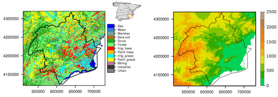 Some of the geographical variables (elevation, distance to the sea, potential insolation and TWI) used as predictors with the regression methods were calculated from the official 25 m resolution Digital Elevation Model (DEM) downloaded from the Spanish National Geographical Institute (Instituto Geográfico Nacional, IGN) website (http://centrodedescargas.cnig.es/CentroDescargas/index.jsp).