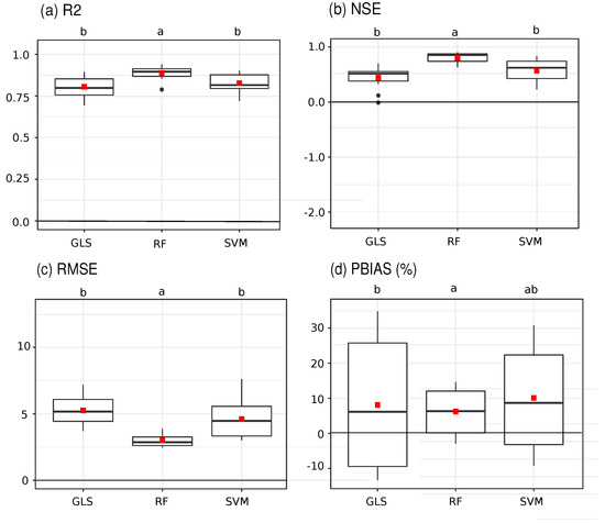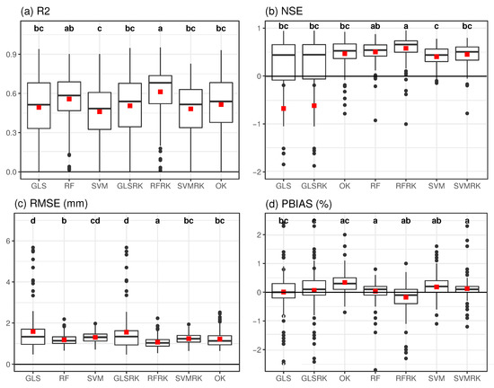 Boxplot showing Anova results of the 4 validation statistics calculated for the seven temperature estimation methods and LOO-CV in spatial domain approach. Significantly different groups (Tukey–Kramer contrast using heteroscedasticity-consistent covariance matrix of the parameters (HC3), alpha = 0.05) are represented by different letters.