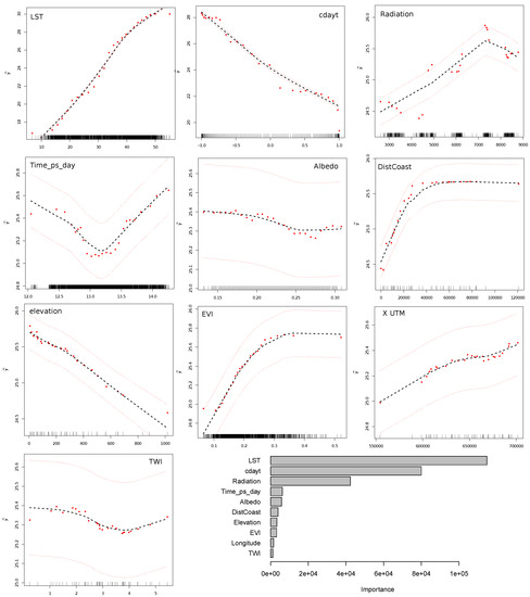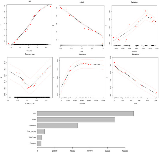 Several approaches have been recently used to estimate air temperature from satellite data; one of the objectives being to use just remote sensing data adding, at most, easy to obtain environmental variables. Jin and Dickinson [24] estimated the diurnal cycle of LST through temporal interpolation of NOAA-AVHRR. Sun et al. [25] used the same method for modeling Geostationary Operational Environmental Satellite (GOES) measurements. Gholamnia et al. [26] attempted to introduce methods that estimate air temperature based on LST data by direct approach and without auxiliary environmental information. Golkar et al. [27] estimate instanteneous air temperature using standard remote sensing methods with minimum data. Mira et al. [28] tried to introduce LST and elevation as predictors to a multiple linear regression model (MLRM). Recently, machine learning methods have been compared with traditional MLRM; for instance, Xu et al. [14] stated that linear regression cannot predict the air temperature based on LST in all conditions and that RF models obtain better accuracy than the MLRM.