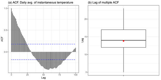 In order to implement k-block-CV, a prior study of the temporal and spatial autocorrelation of the daily instantaneous temperature was carried out. The temporal autocorrelation was analysed using autocorrelation functions (ACF) and partial autocorelation functions (PACF), and the spatial autocorrelation was analysed using semivariograms. In both cases the objective was to identify the distance (meters) and time lag (days) beyond which autocorrelation ceases to affect. The lag values of the ACF in each station and the ranges of the semivariograms in each day were obtained, allowing to estimate the adequate size for the k-spatial and k-temporal blocks inside each k-spatial block. The number of resulting blocks was the number of spatial multiplied by the number of temporal blocks.