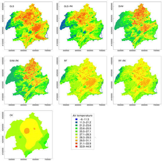 On average, validation statistics indicate that RFRK obtains the most accurate results, followed by RF. In addition, GLS and GLSRK show very high prediction errors, although predictions with absolute residuals larger than 20 °C were filtered out. When this filtering was carried out, the final number was 3886 in the GLS and GLSRK models. In the case of GLS and GLSRK, errors occurred in areas outside the domain and/or range of the data and in areas with local effects that implied situations not considered in the linear relationship estimated in the general model. In these cases, as can be seen in Figure 4, machine learning methods are more accurate. This difference is due to the fact that the linear models predict poorly outside the boundaries of the training data set, whereas the machine learning methods have a better generalisation capability and predict well outside the boundaries of the training data set [73].