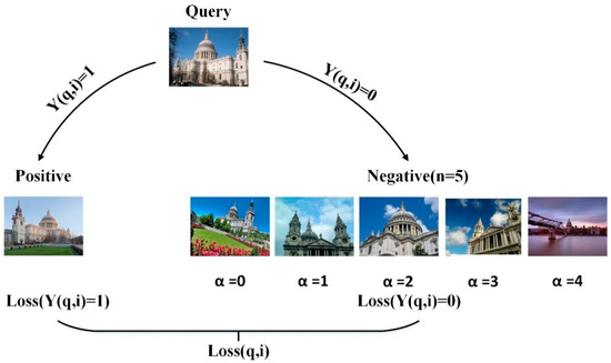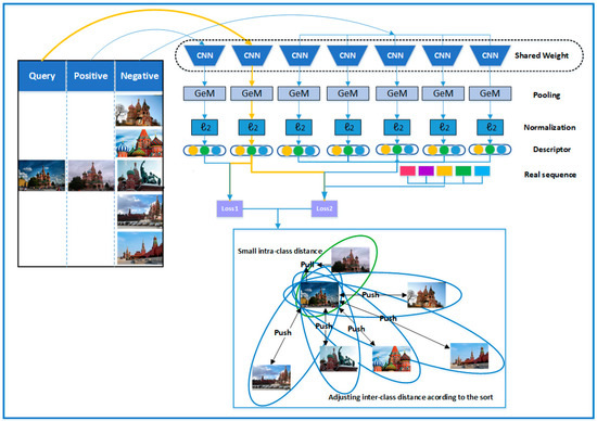 Within the frameworks of metric learning, loss functions form the key component and current works have proposed various loss functions in which contrastive loss masters the interactional relationships among pairwise data points, with similarity and dissimilarity as a case in point [4]. Triplet losses have also been intensively studied [5,6], with an anchor point, a similar (positive) data point and dissimilar (negative) data point constituting a triplet. Triplet losses aim to learn a distance metric, where the anchor point closes to the similar data point, rather than the dissimilar ones through a margin. The model of triplet loss training has significant randomness when selecting samples, and it takes a long time, which leads to relatively large intra-class spacing, and it also has weak generalization ability from training to testing. Therefore, the quadruplet network [7], the triplet loss with batch hard mining (TriHard loss) [8] and the mining network of marginal sample [9] came into existence. However, these conjoined networks usually rely on a simple network structure. The network architecture involves the collection and aggregation of regions. Its accuracy and robustness of image retrieval is low, and more importantly, the existing metric learning network is characterized by shortening the distance between the query image and positive samples, meanwhile widening the distance towards negative samples. The same value is adopted in the distance setting between the sample and the query image. However, not all negative samples have the same dissimilarity with the query image. Thus, designing a new CNN network and learning strategies are important for making the most of training data.
