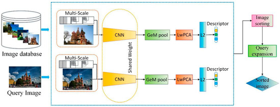 More recent approaches to image retrieval replace the low-level hand-crafted features with deep convolutional descriptors obtained from convolutional neural networks (CNNs), typically pre-trained on large-scale datasets such as the ImageNet, forming compact image representations, so as to present a promising direction. Early approaches to applying CNNs for image retrieval included methods that set the fully-connected layer activations to be the global image descriptors [1,14]. Husain proposes a global descriptor REMAP based on CNN, which learns and aggregates the hierarchical structure of deep features from multiple CNN layers, and learns discriminative features which are mutually-supportive and complementary at various semantic levels of visual abstraction [15]. Perronnin and Jegou et al. aggregated deep convolutional descriptors to form image signatures using Fisher Vectors (FV) [16], Vector of Locally Aggregated Descriptors (VLAD) [17] and alternatives [18,19,20]. Tolias et al. [21] have proposed R-MAC to produce a global descriptor by aggregating the activation features of a CNN. One step further is the weighted sum pooling of Kalantidis et al. [22], which can also be seen as a way to perform transfer learning. Popular encodings such as BoW, BoW-CNN and Fisher vectors are adapted in the context of CNN activations in the work of Kalantidis et al. [22], Mohedano et al. [23] and Ong et al. [24], respectively. In image retrieval, the query expansion is used to enhance the image retrieval efficiency [25,26,27]. Shen [28] proposed using a small number of training images to learn low-dimensional subspaces, by preserving neighbor-reversibility (NR) correlation to enhance training efficiency.