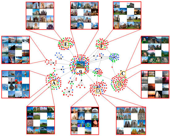 The selection of negative images: every cluster is formed by similar images; q is the query image; A,B,C,D,E,F are the negative images with low similarity to the query image.