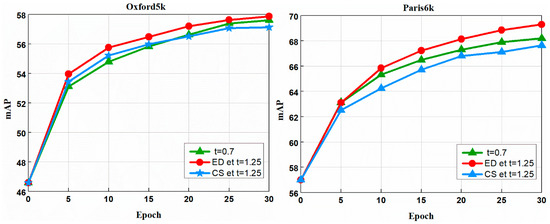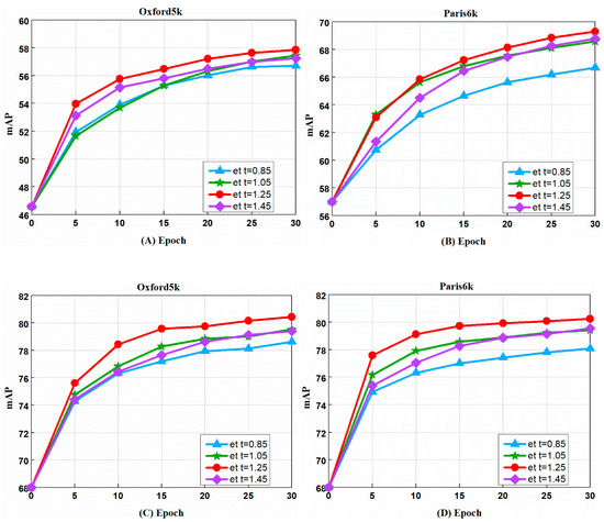 Performance comparison of choice of the different t selection: (A) Evaluation is performed with AlexNet with GeM layer on Oxford5K; (B) Evaluation is performed with AlexNet with GeM layer on Paris6k; (C) Evaluation is performed with VGG with GeM layer on Oxford5k; (D) Evaluation is performed with VGG with GeM layer on Paris6k.The curve line presents the evolution of mAP depending on training epochs. Epoch 0 reflects off-the-shelf network. Multiple loss is used in all approaches unless otherwise specified.