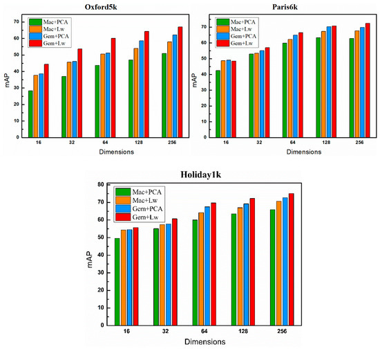 We compared the performance of cross-combination of Mac pooling, GeM pooling, PCA whitening and Lw whitening in different dimensions. The performance of image retrieval in image vector from 16 to 256 is shown in Figure 9.
