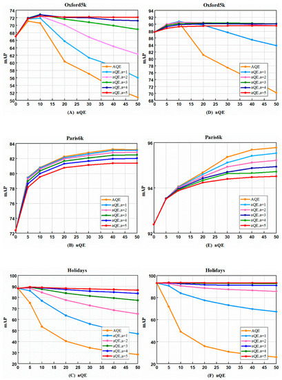 The evaluation of performance on α-weighted query expansion (αQE): (A) AlexNet with GeM layer, and Lw on Oxford5k; (B) AlexNet with GeM layer, and Lw on Paris6k; (C) AlexNet with GeM layer, and Lw on Holiday; (D) ResNet with GeM layer, and Lw on Oxford5k; (E) ResNet with GeM layer, and Lw on Paris6k; (F) ResNet with GeM layer, and Lw on Holiday; The standard average query expansion (AQE) is compared to our αQE for different values of α and the number of images used nQE.