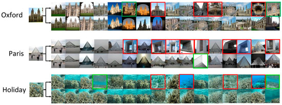 We adopt the training dataset constructed by Schonberger et al. [35]. The dataset includes 7.4 million images, which are searched and downloaded by Flickr, with popular landmarks throughout the world. The dataset uses bag-of-word model (BoW) and structure-from-motion (SfM) to reconstruct the 3D model, and uses a method exempt from manual annotation to automatically obtain a large dataset with a query image, a positive image, and a cluster with serial number. There is a total of 91,642 training images in the dataset, and 98 cluster images identical or nearly identical to the test dataset can be excluded through image retrieval based on BoW. About 20,000 images are selected as query images, 181,697 pairs of positive images, and 551 training clusters, including more than 163,000 from original datasets, by the minimum hash and spatial verification methods mentioned in the clustering procedure [27]. The original datasets contain all the images of the Oxford5k and Paris6k datasets.