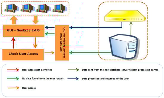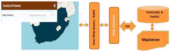 The backend PostgreSQL database management system was spatially enabled using the PostGIS extension. PostGIS, through its generic index structure (GIST), embeds the spatial functionality to enable PostgreSQL to efficiently handle spatial data, indexes, GIS algorithms, and geographical analysis functions. The integration of PostGIS was done through the data connection method aimed at upgrading the PostgreSQL object-relational database into a backend spatial database with GIS capability. Moreover, PostGIS adds indexing, transaction, and concurrency functionality to PostgreSQL. PostgreSQL is a robust object-orientated relational database management system with a proven ability to work in high volume environments. It is ACID (atomicity, consistency, isolation, and durability) compliant. MapServer was integrated to support the display of dynamic geospatial maps over the internet. It supports the display and querying of raster and vector datasets from the database. Aside from querying capabilities, the integration of MapServer was aimed at enabling on the fly projections, spatial analysis and editing, high-quality rendering, cross-platform compatibility, and data interoperability. It has client and backend functionality, enabling the implementation of a hybrid architectural design that is known to improve system efficiency and online geospatial analysis.