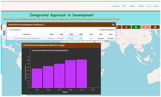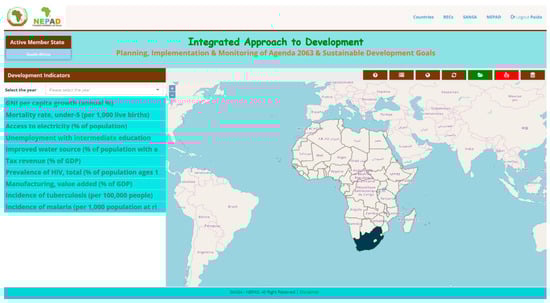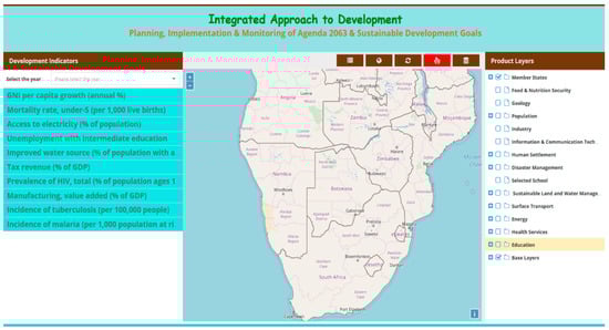 Lately, several geoportals have also been launched in Africa. In our review of African geoportals, we observed that most geoportals serve as platforms for geospatial data dissemination for specific projects, examples include the MESA SADC Geoportal, National OCIMS Geoportal, and the WASCAL Geoportal. A similar observation was made for continental, regional, and national geoportals such as the RCMRD Geoportal, Africa Geoportal, and GeoCameron. From our assessment, the current geoportals are not specifically aimed at tracking Agenda 2063 development indicators but serve as online geospatial data distribution platforms. In many cases, the geoportals also lack the basic analytical capability and spatial analysis functionality. While several geoportals already exist internationally as recently reviewed by Jiang [], currently none of them are targeted towards the monitoring and evaluation needs of Agenda 2063 on a continental scale. Similarly, an inventory of geoportals done by Jiang [] clearly shows that African countries lack a common online platform for uploading, access, visualizing, storing, analysing, and disseminating development information related to Agenda 2063. To bridge the gaps, there is a need to provide a geoportal dedicated to the monitoring of Agenda 2063 development indicators that has analytical and spatial analysis capability.