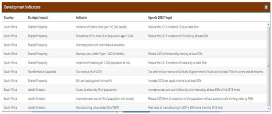 In this geoportal, we selected several development indicators related to the strategic impact areas of shared prosperity, wealth creation, and transformative capacities. The snapshot in Figure 8 below illustrates the results of our implementation. We show for each country, the high-level strategic impact, the indicator, and the Agenda 2063 target.