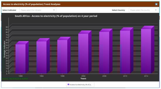 The charting capability of the geoportal is demonstrated in Figure 9 and Figure 10 below. We show the ability of the geoportal to provide graphical plots of the development indicators over time to support trend analysis. In this paper, we used the access to electricity development indicator to showcase the geoportal graphical plotting capabilities.