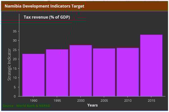 Information regarding the strategic impact areas can also be graphically displayed on the geoportal. Figure 13 below illustrates the temporal trends for manufacturing, value-added from 1990 to 2015 and shows the expected target. For manufacturing, the value added is a wealth creation indicator. Similarly, the GNI per capita growth is shown in Figure 14 and mortality rate trends are shown in Figure 15 for the same period. GNI per capita growth and mortality rate for children are the five years, and are both shared prosperity indicators. Tax revenue, a transformative capacity indicator is shown in Figure 16.