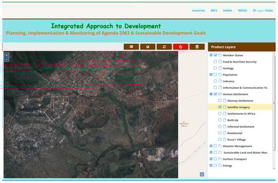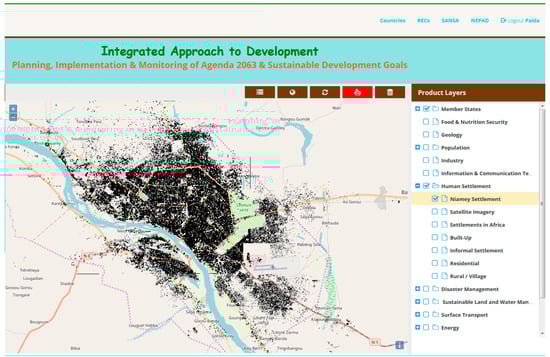 The strength of the Agenda 2063 lies in its ability to integrate and visualize the various statistical development indicators with geographical vector and raster datasets. In Figure 17, we show the ability of the geoportal to display human settlements layers over the city of Niamey in Niger.