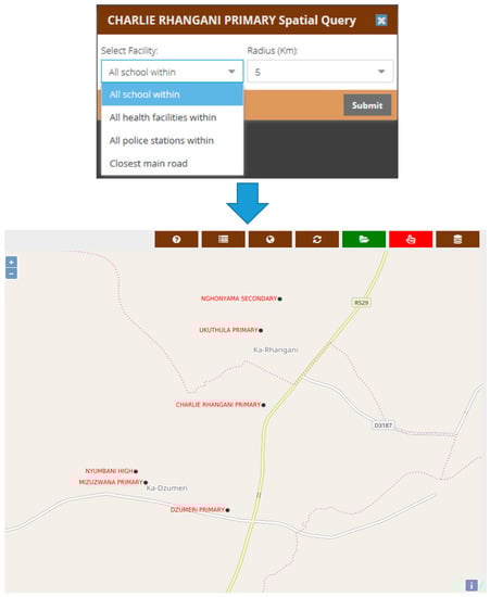 The geoportal is spatially enabled to perform a wide range of spatial analytical functions through the integration of the PostGIS onto the PostgreSQL relational database. Some of the basic functions currently performed by the geoportal include buffer analysis, map overlay, spatial filtering, attribute queries, spatial queries, distance querying, and calculation of areas and length. The attribute and spatial querying functionality are shown in Figure 19 and Figure 20 respectively. Figure 21 illustrates the buffering capability of the geoportal in the selection of schools within a specified distance from a selected school.