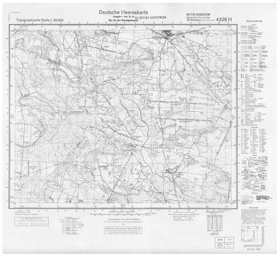 The sheets listed above conformed to the project assumptions as regards the large scale of the maps and their contents. The charting years indicate that no construction works related to the mining and power facility had started in the analyzed area. In addition, the mapping precision guarantees the sufficient quality of the data, while containing no misrepresentations. An additional advantage was the availability of scanned sheets of good resolution (300 and 400 dpi, made available by the Cartographic Archive of the Faculty of Geographical Sciences of the AMU in Poznań). The fact that the entire analyzed area was spread across six sheets (Szczerców 4328 H Scherzau (Figure 1); Rząśnia 4428 B Ronsau; Sulmierzyce 4428 C Sulmers; Wojciechów 4429 A Wojciechow; Kaszewice 4328 J Kaszewice; Łękawa 4329 G Lenkau) can be regarded as a drawback. The sheets required merging in a specialist graphics editor. After creating a base covering the entire study area, the image was calibrated. Georeferences were superimposed using a reference map—raster topographic map at a scale of 1:25,000, imported to the program using the WMS (Web Map Service) offered by polish national geoportal. About a dozen georeferenced points were placed at characteristic locations, such as crossroads or elevation points, of the same value on both maps. In order to perform adequate graphical conversion, the appropriate kind of geometric correction must be selected. For this, available transformation types were tested and the one generating the fewest errors and distortions was selected [21]. After testing, the ‘adjust’ transformation was performed.