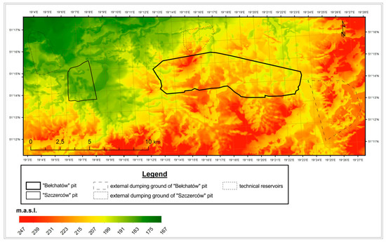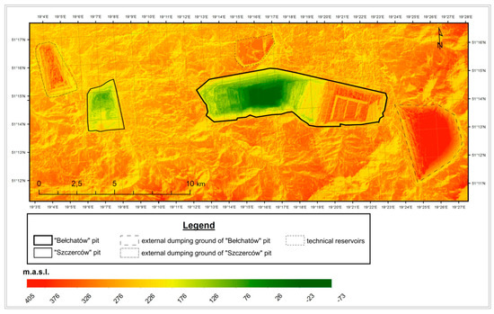 Opencast mining is a type of human activity, which influences all elements of the natural environment. Building an open-pit mine introduces massive transformations in the lithosphere, atmosphere, hydrosphere, pedosphere and biosphere [1]. In addition, opencast mining has impacts on socio-economic components of the environment. The authors here have attempted to present the changes caused by the construction and operation of the Bełchatów Coal Mine—Poland’s largest, and one of Europe’s larger, open-pit mines. The choice of the studied area was not random, as the area related to the operation of the Bełchatów Coal Mine and Power Plant is a place where the amount of changes introduced to the geographic environment, and particularly the lithosphere, was unprecedented in Poland. Since the discovery of the deposit in 1960 and the commencement of excavations in 1975, the environs of Bełchatów have become the focus of research for scientists of all fields. The initial works concerned planning, and attempted to predict the direction of environmental changes which this investment was to introduce [2]. The geological literature is also particularly rich, which originally concerned boreholes [3], and led to the analysis of outcrop sediments and structures [4], as well as hydrological observations [5].