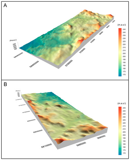 Digital Elevation Model of the analyzed area from the post-investment period. Three-dimensional view using a standard color ramp with shading, z-factor value of 7—SW view (A)and SE view (B). Source: Own elaboration.