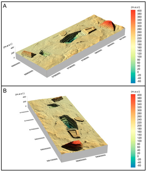 A superficial analysis of cartographic materials reveals that anthropogenic transformations occurred in three variants. First, pits were created by removing layers of the Quaternary surface, as was the case with the “Bełchatów” pit, and later the “Szczerców” pit, and technological reservoirs. The second variant of transformations was the creation of new convex forms, using mostly the material collected while excavating pits, which forms the dumping grounds. The third variant was the leveling of the topography [6]. Such a need arose during the construction of the power plant, where a large amount of buildings and equipment had to be erected. This case is similar to the division proposed by David Lorant [7] into excavated forms, referring to surfaces characterized by reduced quantity of material in comparison with the original state, and accumulated forms, characterized by excess material. On the basis of geotechnical criteria, an additional group was distinguished, including forms destroyed by mining works, resulting in leveling of the surface.