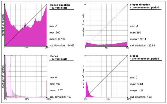 A comparison of changes which occurred in the analyzed area was also conducted on the basis of data from histograms of the raster images presenting features of topography from both periods (Figure 9). The histograms are graphs, which show the quantitative share of values of a given feature in the entire image. Individual values of the feature are marked on the X-axis. Data from the Y-axis indicate how often the given value occurs. Additionally, the elaboration includes statistical data for individual rasters. The following values were calculated: The maximum, minimum, and mean value, and standard deviation. Slope direction and percentage slope values were taken into account.