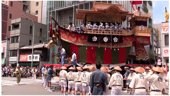 The Gion Festival is one of the most famous festivals in Japan. Its origin dates to the year 869, when it was instituted as a religious ceremony to appease the gods during the outbreak of an epidemic. The festival occurs annually in Kyoto city and spans the entire month of July. The highlight of the festival is the Yama-Hoko float procession, which consists of parades of beautifully decorated festival floats in mid-July. The Yama-Hoko floats are portable shrines in which go-shintai, the physical objects in which the gods reside, have been installed. The Yama-Hoko float procession that accompanies the opening of the festival is called the sakimatsuri, and the return procession is called the atomatsuri. The boat-shaped Ofune-hoko float (see Figure 1), which is the focus of this paper, is an important Yama-Hoko float that is in the final position in the atomatsuri procession every year.