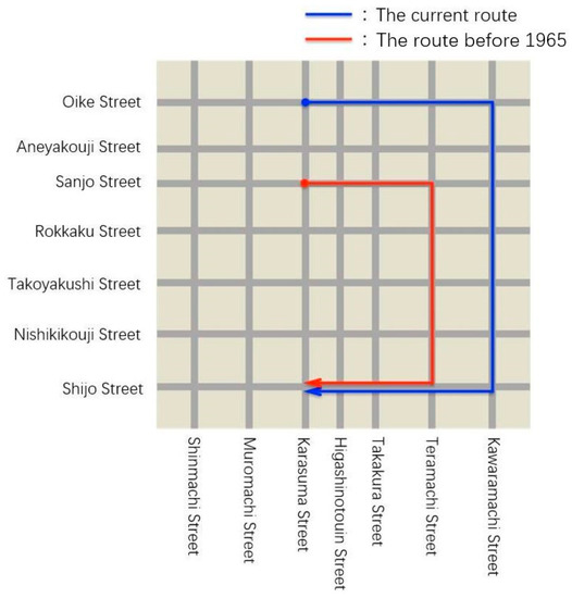The current route and the original route of the atomatsuri procession of the festival floats in the Gion Festival.