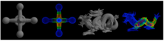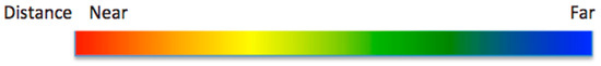 We adopt a white color for the collision area and a rainbow of colors (see Figure 4) for the high collision risk areas. This combination of colors is useful, since the two colors never overlap. For the case that the inter-point distance is exactly ε—that is, for the minimal non-colliding distance—the high collision risk area color is red. Over a proper large threshold inter-point distance dmax, the point color is blue. Below, we call the blue area the collision-free area. Figure 5 shows examples of assigning the above-mentioned colors to colliding surfaces.