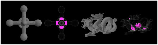 All of the visualization experiments using stochastic point-based transparent rendering presented in our work are based on the Mac OS environment, using existing libraries including Kyoto Visualization System (KVS) [25], Point Cloud Library (PCL) [26], OpenGL Utility Toolkit (GLUT) [27], and OpenGL Extension Wrangler Library (GLEW) [28]. The resolution of all experimental results is . The image resolution does not affect the rendering speed if the number of rendered points is too large. Note that this image resolution is independent of the collision detection accuracy.