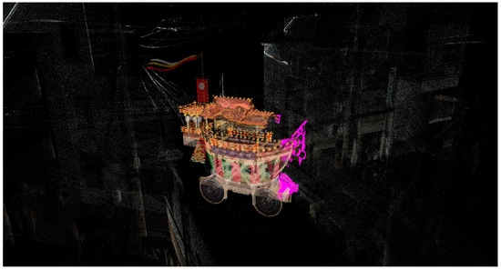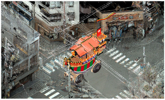 Referring to the actual procession route, we moved position of the Ofune-hoko float to the appropriate direction along the street by repeating translation in parallel to the street and rotation centered at the front part of the float. Although actual movement of the float is not completely parallel to the street, our simplified movement can tell us most of the possible collisions. Based on the knowledge acquired from the simplified movement, we can consider how to avoid collisions by adopting additional fine-tuning of the movement. Figure 10 shows the result of placing the point cloud of the Ofune-hoko float in the scene of Figure 9. We can clearly foresee that the float will collide with the electric wires when moving in the street. Collisions with billboards and other objects are also expected when turning at a street intersection.