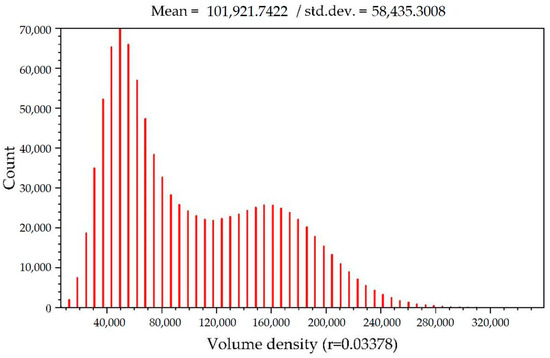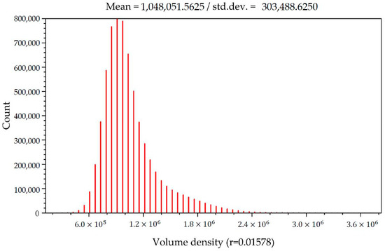 To estimate the density of the point cloud, we first generate a minimum bounding box for each data. The density is estimated by counting for each point the number of neighbors N (inside a sphere of radius r—in the current work, r is set to 1/1000 of the bounding-box diameter of the scene). Therefore, volume density is the number of neighbors divided by the neighborhood volume as, given by Equation (2).