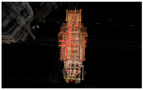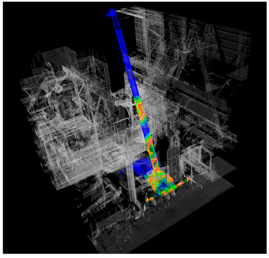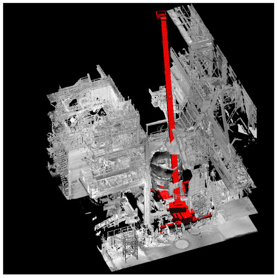Figure 17 shows the result of placing the point cloud of the crane vehicle in the scene of Figure 16. Since the data of the plant and crane vehicle in this experiment have no color information, in order to distinguish these two objects, we directly set the color information of the crane vehicle point cloud to red. To more clearly illustrate the collision detection results, we randomly placed the crane vehicle data in the plant. From Figure 17, we can clearly see that the crane vehicle collides with pipes, machinery, and walls in the plant, but it is difficult to determine where the collision occurs on the crane vehicle.