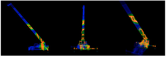 Figure 19 shows the transparent visualization results of the crane vehicle without showing the point cloud of the plant. In this case, we can analyze the problem of the crane vehicle separately and find the specific locations of the collisions.