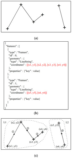 MultiLineString type vector data in GeoJSON: (a) MultiLineString type vector data; (b) GeoJSON format of the MultiLineString type vector data; (c) The direction of the line feature and visual representation of GeoJSON data structure of MultiLineString type vector data.