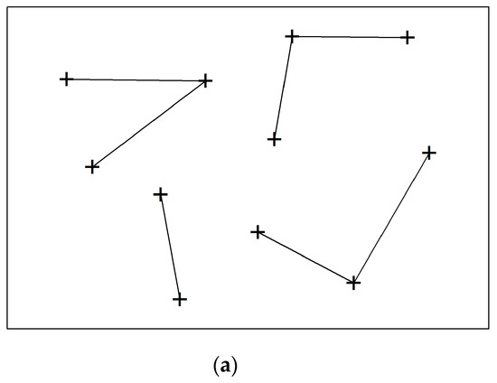 In the GIS vector data, the angle between the features will remain unchanged if the spatially relative positional relationship between the two features does not change (equal or similar in geometry). In the algorithm of this paper, the angle is an important measure indicator. The calculation of the angle is based on point coordinates, and is divided into azimuth angle and included angle. Let the coordinates (x1, y1) and (x2, y2) be the start and end points of the line segment P, respectively; then, the included angle α between the line segment P and the x-axis can be calculated as depicted in Equation (1):