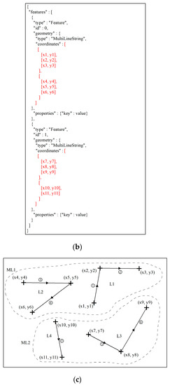 Line vector data spatial distribution of the MultiLineString type and the corresponding GeoJSON format data is shown in Figure 4. Figure 4a is slightly different from Figure 3a in the spatial representation of the data, but after parsing the GeoJSON structure onto the graph, it can be seen that lines 1, 2, 3, and 4 in Figure 4c are combined to belong to one line feature, ML1, which corresponds to the first JSON record of the “features” key in Figure 4b. In line feature ML1 of Figure 4c, fold line L1 and fold line L2 are spatially disconnected, so the three vertex coordinates of L1 and the three vertex coordinates of L2 are stored in the first element and second element of the “coordinates” key value, respectively, to indicate the spatial relationship between the lines. In addition, the GeoJSON format divides the line feature into the smallest unit (line segment) at first when storing the spatial information of the line vector data, and then stores the vertex coordinates of the line segment into the JSON data, as can be seen in Figure 3b and Figure 4b.