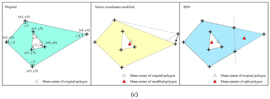 Detection indicators of point, line, and polygon: (a) Detection indicators of point; (b) Detection indicators of line; (c) Detection indicators of polygon and change of mean center when the polygon is modified.