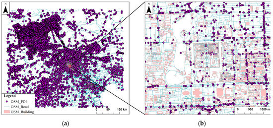 The dataset of this paper uses the shapefile vector dataset in OpenStreetMap. The point features are interest point data, including places, POIs, traffic, and transport. The line features use road data, the polygon features use building data, and the range of the latitude and longitude of experimental data are 113.963°–118.493° E and 38.302°–42.125° N, the coordinate system of experimental data is GCS_WGS_1984, the overall data overview is shown in Figure 11a, and the local details are shown in Figure 11b. It is essential to pay attention to the elimination of multipoint, multiline, and multipolygon when converting the shapefile format data to the GeoJSON format because the algorithm specifies the GeoJSON format type of vector data as Point, LineString, and Polygon. The data preprocessing process is shown in Figure 12.