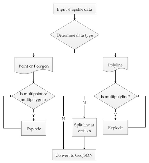 From the analysis of the GeoJSON data structure, it can be seen that the three types of vector data (Point, LineString, and Polygon) are clearer in the expression of feature spatial information than MultiPoint, MultiLineString, and MultiPolygon. Therefore, the algorithm specifies the geometry type in the GeoJSON format as Point, LineString, and Polygon in the design process.