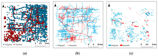 We selected a certain amount of points, lines, and polygon features from the experimental dataset and set different attack levels to examine the robustness of the algorithm. Taking 20% of features as an example, the comparison of different types of data and original data after the interpolation attack is shown in Figure 13. The test results are shown in Table 2, which show that the proposed algorithm has high accuracy for the detection of interpolation attacks. The interpolation attack only adds features and does not modify the spatial information of the original data, hence most digital watermarking algorithms are effective for the detection of interpolation attacks.