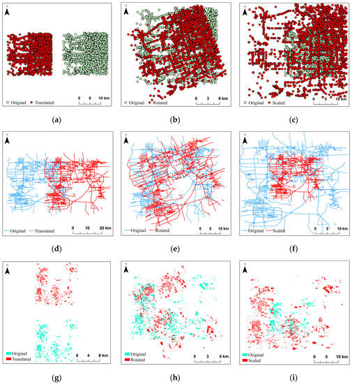 Comparison of different types of data and original data after similarity transformation attack: (a) Translation attack of point type vector data; (b) Rotation attack of point type vector data; (c) Scaling attack of point type vector data; (d) Translation attack of line type vector data; (e) Rotation attack of line type vector data; (f) Scaling attack of line type vector data; (g) Translation attack of polygon type vector data; (h) Rotation attack of polygon type vector data; (i) Scaling attack of polygon type vector data.